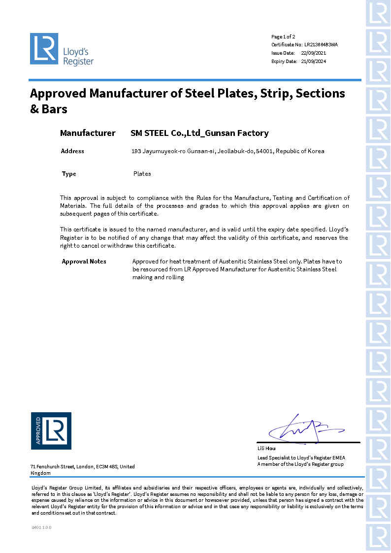 품질인증 일반 ISO 19443 BIS ISO 45001 특허증 (지능형 분할처리용 대차) 특허증 (지능형 분기처리용 대차) 특허증 (입식 약액처리 부스) 특허증 (환봉 정렬형 스키드) 특허증 (후판용 가열로) ISO 9001 ISO 14001 PED + AD2000 CPR JIS 선급 ABS BV NK DNV LR KR RINA RS CCS